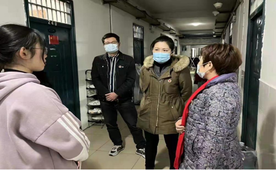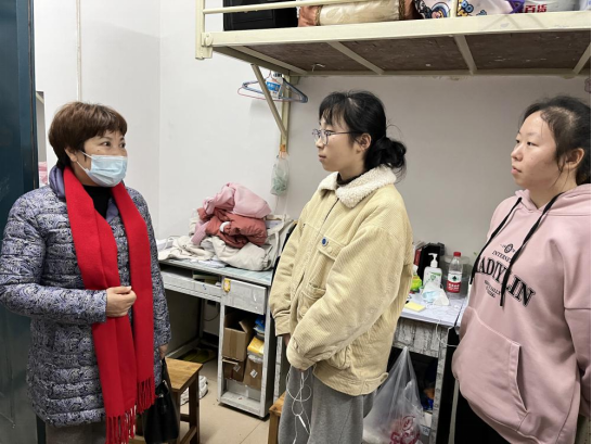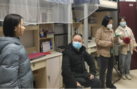 领导老师们询问了同学们学习生活情况,叮嘱同学们要积极配合疫情防控工作。宣传统战部副部长陈璐提出,要坚持“晨午晚”三检工作,非必要不出娄、不出校。在了解宿舍疫情防控开展的情况后,院党总支书记李伶指出,寝室管理是疫情防控的基础环节,做好寝室疫情防控至关重要,出入校园务必带好口罩和校徽。院长张卫明表示,目前疫情防控到了最吃紧的关键阶段,要做好宿舍环境消毒工作,做到防控无死角,为学生提供良好的学习生活环境。
