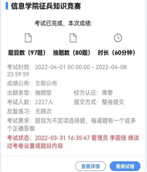 此次答题活动,采取不定项选择的题型,将我国《兵役法》、《征兵工作条例》、《2022年大学生征兵工作实施方案》、《国防教育法》和《2022年大学生应征入伍相关优待政策》灵活地融入到征兵知识考题之中。同学们积极备考、认真答题,共计2227名学生参赛,其中2068人取得70分以上(总分80分)的好成绩,参与率达92%。答题活动增进了同学们对征兵工作的了解,激发了参军报名的热情。(颜聪玲供稿)