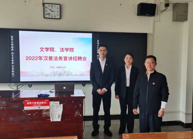 5月13日下午,文学院、法学院邀请汉普法务公司于致远楼217教室召开宣讲招聘会。文学院党总支书记尹钟宏、法学院党总支书记肖兵明、文学院党总支副书记毛永宁、法学院党总支副书记刘景春、汉普法务公司负责人及文学院、法学院大四毕业生参加。