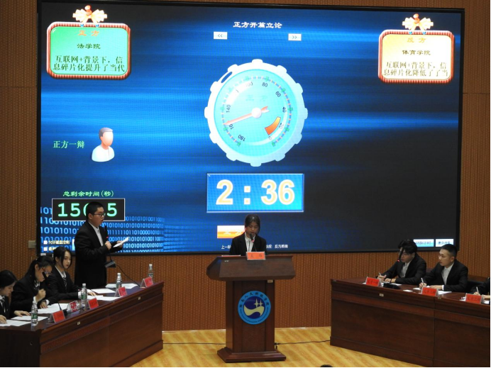 文学院党总支书记尹钟宏、校团委副书记刘佳、马克思主义学院陈琳博士三位老师组成评委团。体育学院党总支副书记谢嘉、法学院党总支副书记刘景春和两个学院辅导员老师作为嘉宾观看比赛。法学院“人民说的都队”与体育学院“体院辩论队”围绕“互联网+背景下,信息碎片化提升了还是降低了当代人的认知水平”这个辩题展开了激烈的辩论。