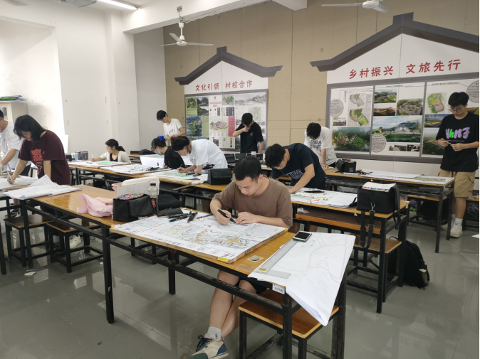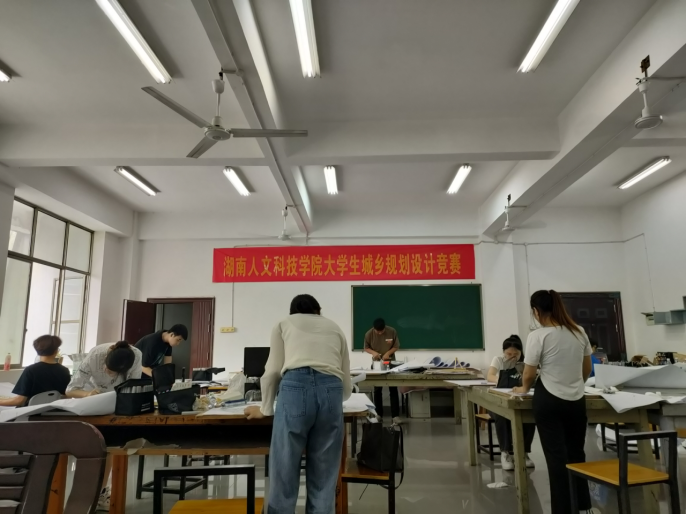 在逸夫楼4楼的5个教室,全校57名同学参加了本次选拔赛,校赛胜出代表将参加今年10月份的湖南省大学生城乡规划设计竞赛决赛。竞赛以“绿色·生态·碳汇”为主题,检验参赛选手对城乡规划领域的区域选址、总体规划、交通组织、空间布局、建筑组合和景观营造等专业设计核心能力和快速手绘表达能力的认知,根据学科关注社会前沿问题、热点话题等。选手们通过自选基地,围绕“某城乡生态回迁社区规划设计”主题进行了6个半小时的规划快题设计。