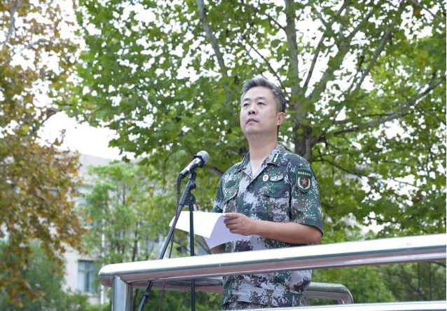 军训团政委陈刚带领师生回顾了沉痛的民族历史,告诫师生居安思危,警钟长鸣。他以“三要”为核心,鼓励师生要坚定不移跟党走,凝聚起民族复兴的磅礴力量;也要以史为鉴,面向未来;更要担当尽职,书写中国青年最靓丽的底色。