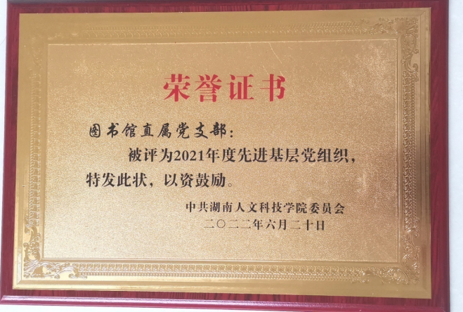 有口皆碑建支部,一腔赤诚话初心。图书馆党支部被评为学校2021年度先进基层党组织。党支部组织委员、副馆长申彦舒被评为校优秀党务工作者,马文卿被评为校优秀共产党员。