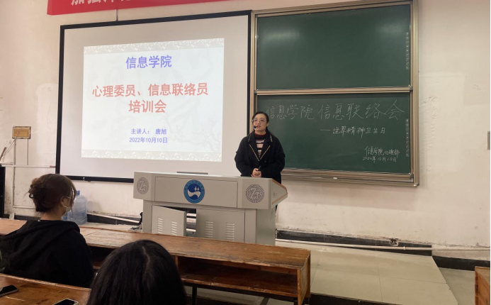 为提高大学生的身心健康意识,科普“10.10世界精神卫生日”知识,10月10日,信息学院在百全楼103室举办2022年世界精神卫生日主题宣传暨信息联络员培训会。辅导员唐旭主持。