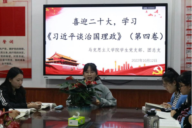 10月12日,马克思主义学院学生党支部、团总支组织学生党员及主要团学干部在若谷楼206党员活动室学习《习近平谈治国理政》(第四卷)。会议由学生党支部书记张得才主持,团总支书记周浩博士领学。
