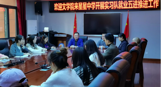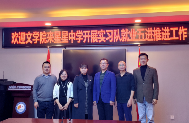 本学年,文学院总结就业工作经验、凝练就业工作成果,组织专班进班级、进寝室、进实习就业基地、进用人单位、进就业困难家庭开展就业宣讲,以就业“五进”机制引导毕业生配合学院就业工作,抓住就业机遇,实现高质量就业。为有序落实“五进”,11月1日,文学院党总支书记尹钟宏、党总支副书记毛永宁、就业专干郭建鹏及实习带队老师王国峰到文学院实习基地娄底市第一中学附属星星中学开展就业工作宣讲活动,文学院校友星星中学副校长禹媚娥亲切接待。文学院在星星中学实习的20名同学参加了座谈会。