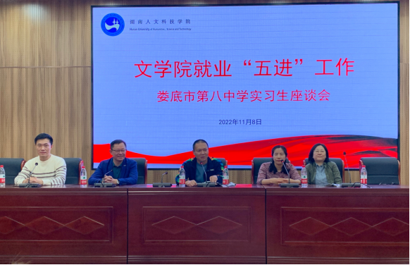本学年,文学院凝练就业工作“五进”机制,通过进班级、进寝室、进实习就业基地、进用人单位、进就业困难家庭开展就业宣讲活动,为毕业生提供点菜式就业服务,引导毕业生尽早实现高质量就业。为继续推进“五进”工作,检查2023届毕业生阶段性实习成果,督导其保质保量完成实习工作,11月8日,文学院组建专班赴娄底市第八中学开展就业宣讲及实习中期检查工作。文学院党总支书记尹钟宏、分管副院长朱艳阳、娄底市第八中学副校长贺旭鹏与在八中实习的20名同学进行了座谈。