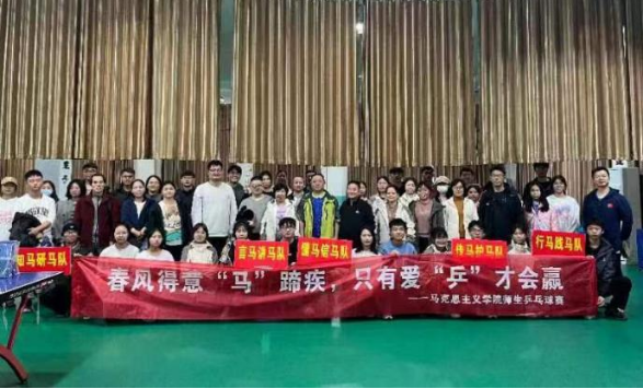 为响应党的二十大提出的“促进群众体育和竞技体育全面发展,加快建设体育强国”号召,增进师生之间友谊,促进师生的身心健康,11月19日上午,马克思主义学院于教工之家举办了“春风得意‘马’蹄疾,只有爱‘乒’才会赢”师生乒乓球赛。
