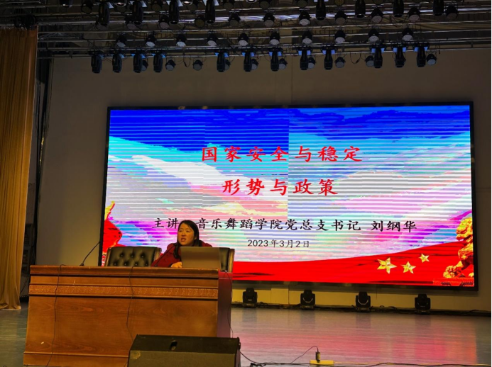 刘纲华以“国家安全与稳定”为主题讲党课。她结合中外的鲜活事例,分析了我国意识形态工作面临的严峻形势、当前国际热点事件和话题,突出意识形态工作在政治建设、安全稳定等方面发挥的重要作用。她强调,大学生需要时刻关注社会动态,把握时代脉搏,关注学校的发展,强化爱党爱国情怀,健康成长成才。(供稿人:杨奕;供图人:胥可盈 一审:唐太文;二审:邓莉立;三审:刘纲华)