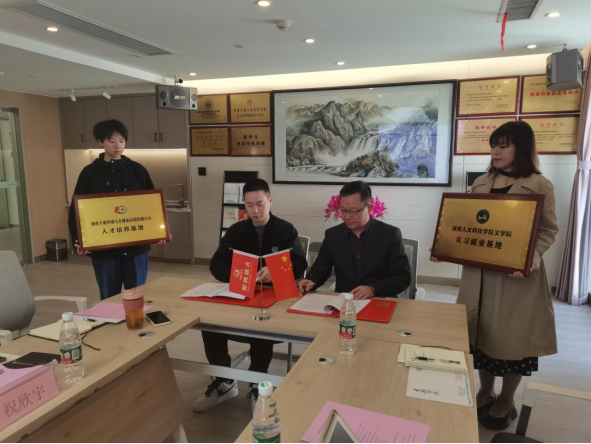 在湖南大瀚舆情与全媒体应用有限公司考察期间,大瀚舆情CEO肖博瀚、项目总监杨光耀、运营总监祝欣宇、办公室主任吕彩红及大瀚团队专家代表新华社湖南分社融媒体主任杨晓明、红网新媒体集团编委、理论评论中心主任王小杨、湖南大学设计研究院教授蔡立良热情接待。杨光耀总监向尹钟宏一行介绍了大瀚舆情智库运营情况和项目成果,双方交流中围绕实习就业达成了多项合作意向,并现场举行了实习就业基地协议签署仪式和挂牌仪式。仪式后,湖南大学梅文慧教授的研究生代表与现场的领导专家进行了座谈,尹钟宏就各位研究生在舆情类课题和文创实践中遇到的问题进行了交流。