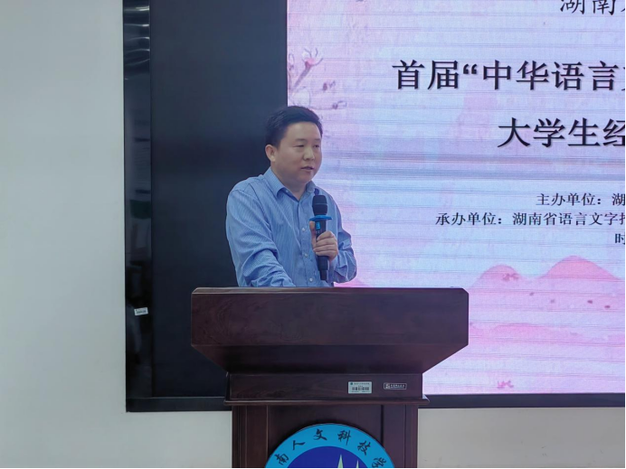 王志和致辞,他充分肯定了本次大赛的意义,希望能通过大赛,引导青年学子阅读经典、传承经典,助力学校书香校园的建设。