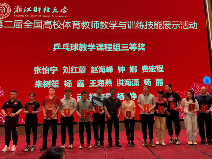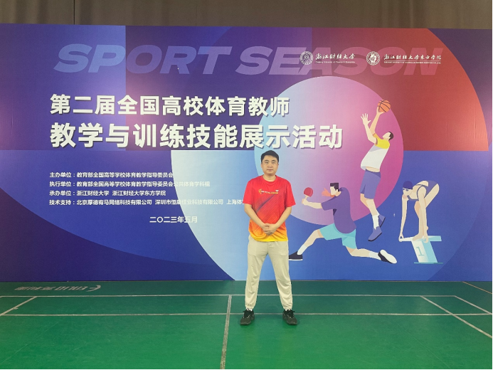 5月25日,第二届全国高校体育教师教学与训练技能展示比赛在浙江财经大学举办。来自全国146所高校的200多名体育教师参与了游泳、乒乓球、篮球3个项目共10个测试内容的技能比拼,太阳成官网体育学院杨鑫老师代表学校参赛并获得乒乓球课程教学组三等奖。