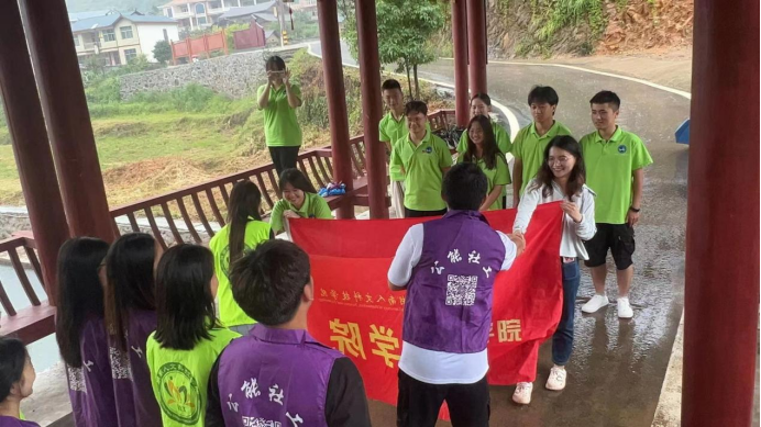 交流过程中,社会工作专业实践团队成员给商学院“遇见‘梅’好”队介绍了佘家村的风土人情及当地红色文化,分享了团队在佘家村开展的“乡村振兴”、“护航花蕾 守护花开”等实践活动所获得的经验。商学院“遇见‘梅’好”队也分享了在赖梅村开展的实践活动,并交流了相关的实践经验。在交流后,两队队员在佘家村的风雨桥进行了旗帜互换仪式。双方队员都希望未来可以一起开展更多志愿服务,共同为绥宁县苗乡侗寨的建设增砖添瓦。