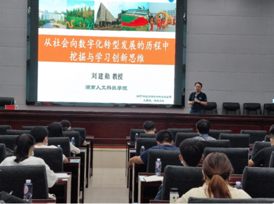 刘建勋教授以“从社会向数字化转型发展的历程中挖掘与学习创新思维”为主题,用通俗易懂的语言,以现场开展问卷调查的独特方式,引出创新、创新思维、数字化社会等概念,结合生动的事例阐述了数字化发展的背景与历程、数字化推动过程中的关键性创新与成果,重点阐述了创新思维和创新型人才培养的具体方法。最后,刘建勋教授对问卷调查结果现场进行了分析,让同学们更直观地感受到数字化已经渗透到社会、经济、生活的各个领域。