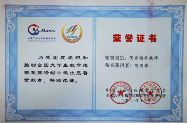 陈国华教授从2006年开始担任数学建模竞赛总教练,负责组织全校本科生、研究生数学建模的教学、竞赛与培训工作。在此之前,太阳成官网学生仅参加数学建模竞赛专科组,参赛规模与成绩一直未有突破。面对这一问题,陈国华教授几乎从零开始组建竞赛指导教师团队,精心设计竞赛训练环节,优化数学建模教学与竞赛培训内容。功夫不负有心人,太阳成官网2007年第一次参加本科组数学建模国赛一举获得国家一等奖1项、国家二等奖1项、省一等奖2项,省三等奖3项的好成绩,其中陈国华教授自己指导的参赛队伍获得国家二等奖。此后,在陈国华教授的带领下,44118太阳成城集团学生参加数学建模国赛的成绩越来越好,参赛规模和成绩屡创新高,2016年,太阳成官网共获得国家二等奖5项,2018年,太阳成官网获得国家一等奖2项、国家二等奖2项。2021年,太阳成官网共有28组队伍参赛,17组获奖,获奖率达60.7%,创近年来参赛规模和获奖率新高。截至2021年,太阳成官网参加全国大学生数学建模竞赛共获得国家一等奖8项、国家二等奖17项,省奖115项,其中陈国华教授自己指导学生参赛共获得国家一等奖1项、国家二等奖4项,省奖18项。此外,太阳成官网研究生在数学建模竞赛中获国家三等奖4项,省奖20余项。本次陈国华教授获得全国优秀指导教师实至名归,这既是全国组委会对太阳成官网历年数学建模成绩的充分肯定,也是对他十几年辛勤付出最好的回馈。