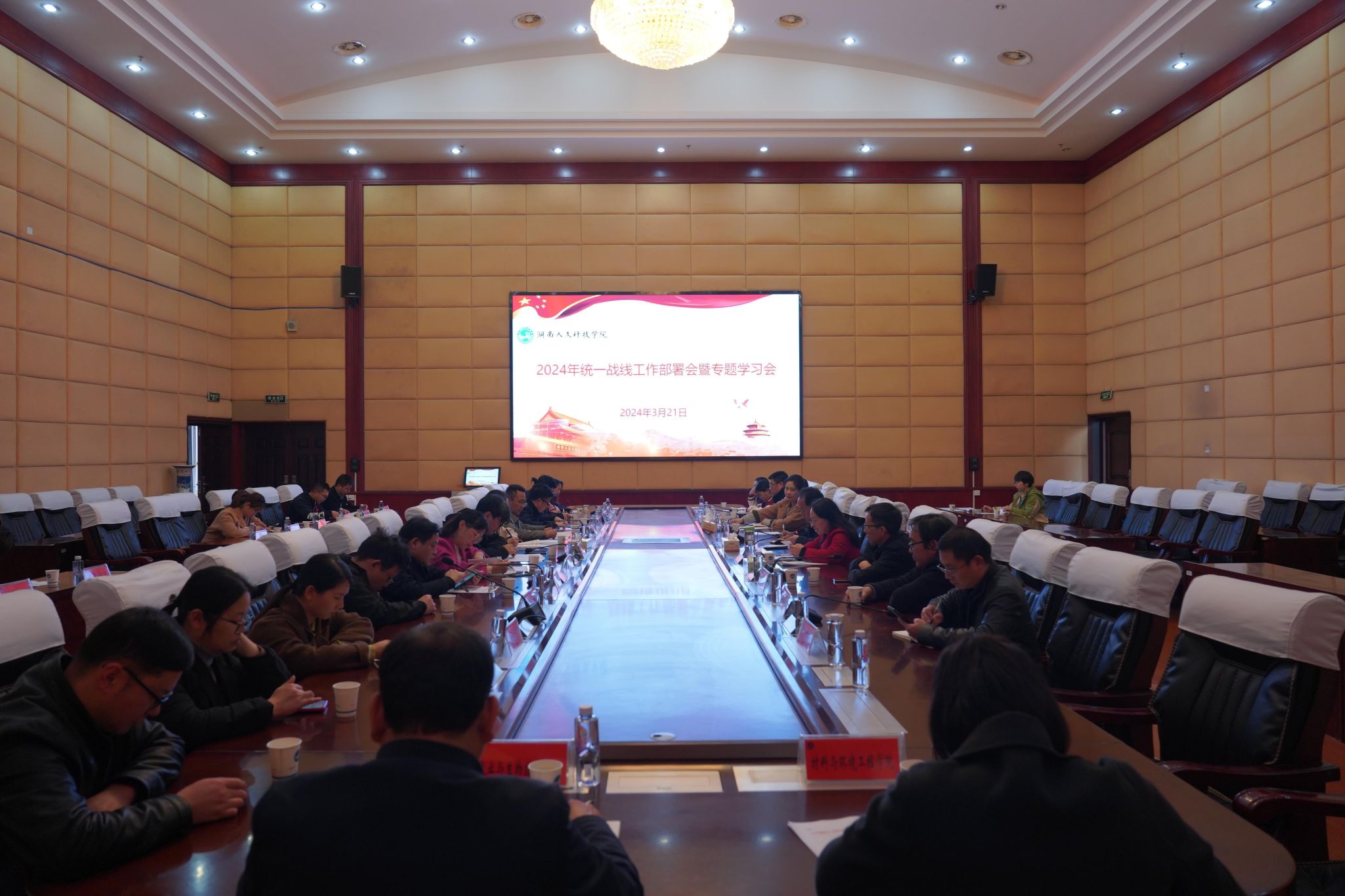 3月21日下午,学校在图书馆一会议室召开2024年度统一战线工作部署会。学校各民主党派、侨联、知联会代表,各二级学院统战委员等参加。党委副书记朱强出席并讲话,宣传统战部常务副部长谢柳主持。