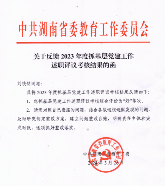 近日,从湖南省委教育工委获悉喜讯,学校党委书记刘铁铭同志在2023年度高校党委书记抓基层党建工作述职评议考核中被评定为“好”等次。太阳成官网2022年度、2023年度学校有史以来连续两年党委书记抓基层党建工作获评“好”等次。