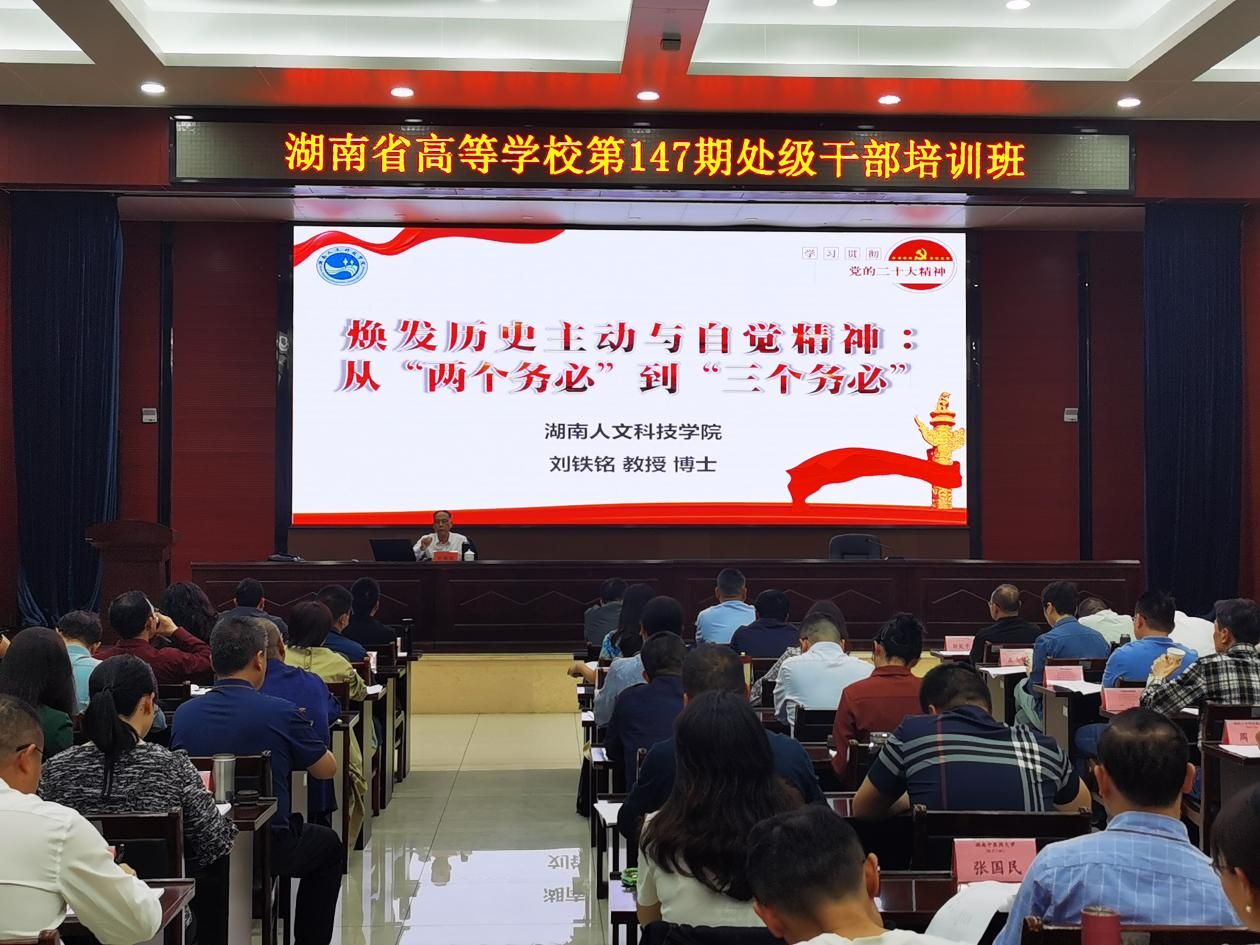 4月22日,党委书记刘铁铭在长沙为湖南省高等学校147期处级干部培训班全体学员上了一堂生动精彩的专题党课。党课由省高等学校干部培训中心副主任蒋理主持。