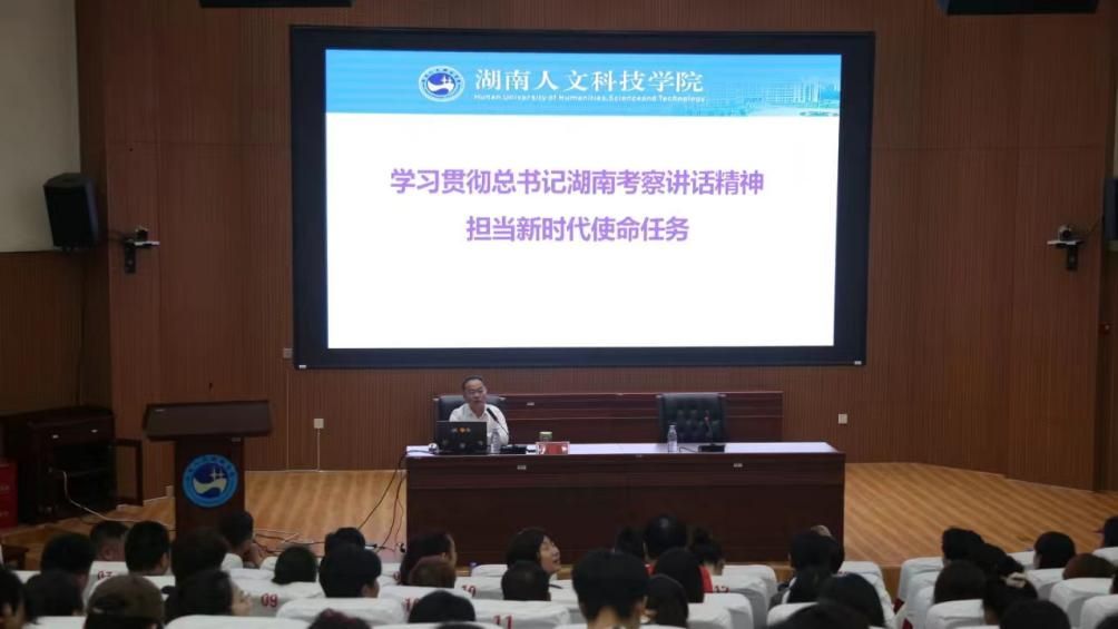 4月16日,党委副书记朱强在匠成楼报告厅宣讲习近平总书记湖南考察重要讲话精神,体育学院全体教职工、学生党员参加。体育学院院长刘玉江主持。