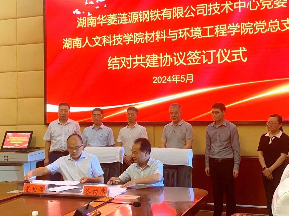 签约仪式上,郑庆、谭峰亮分别代表湖南华菱涟源钢铁有限公司技术中心党委、材料与环境工程学院党总支签订党组织结对共建协议。