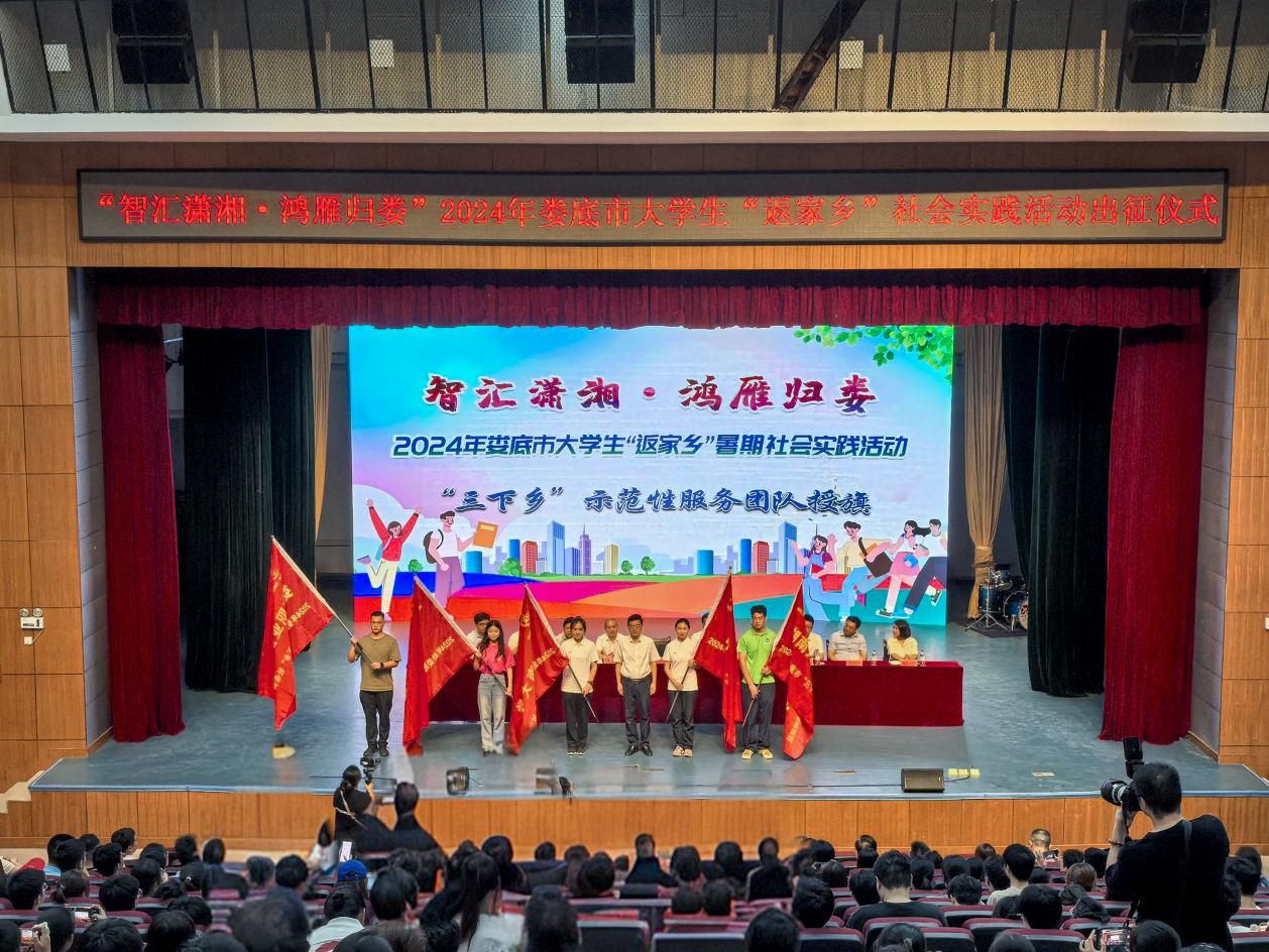 7月16日,“智汇潇湘 鸿雁归娄”--2024年娄底市大学生“返家乡”社会实践活动出征仪式在太阳成官网举行。市委常委、市委组织部部长谢忠阳出席并为6支大学生“三下乡”示范性服务团队授旗,校长盛明科致辞,副校长刘铁峰等参加。