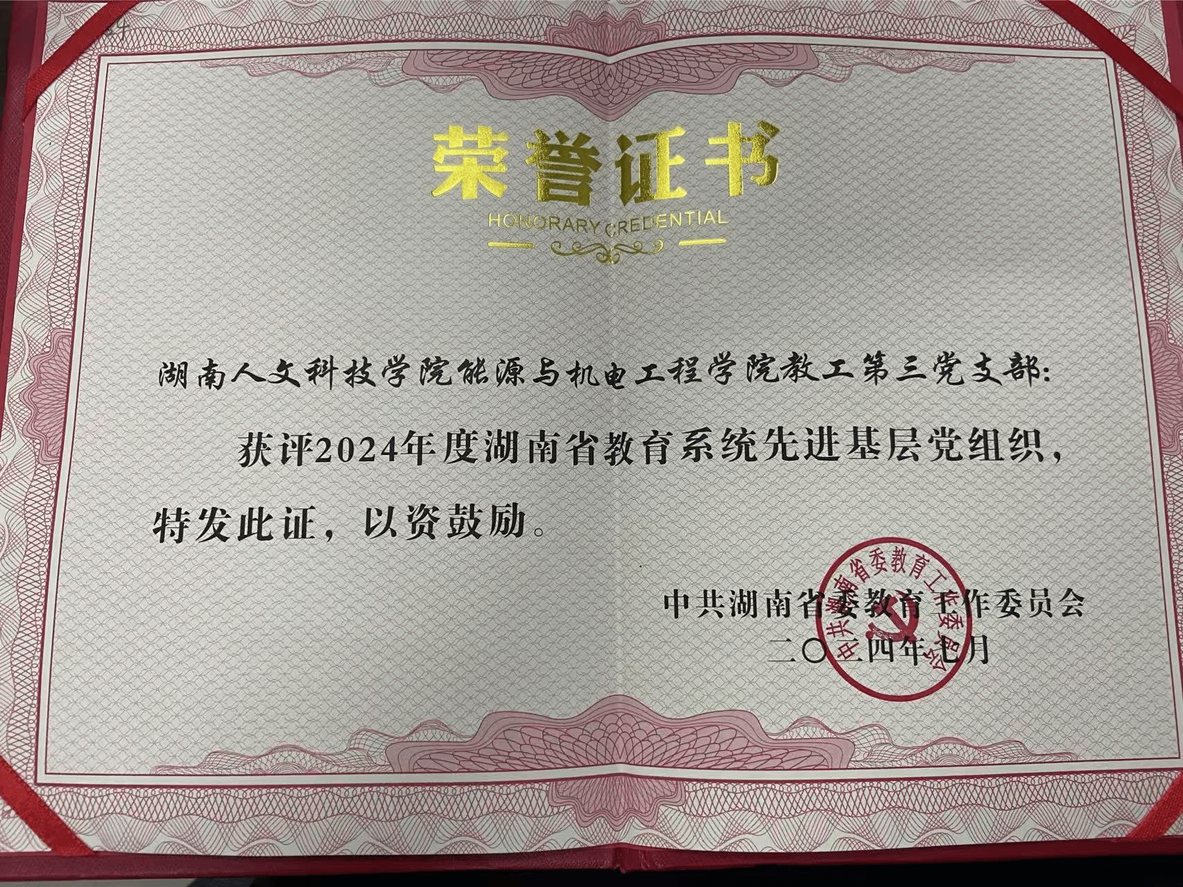 近日,中共湖南省委教育工委正式发布了《关于表彰全省教育系统优秀共产党员、优秀党务工作者和先进基层党组织的通报》(湘教工委通〔2024〕25 号),太阳成官网能源与机电工程学院教工第三党支部荣获全省教育系统“先进基层党组织”称号。