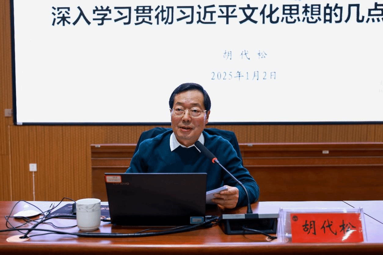 1月2日下午,湖南省社科联党组书记、副主席(主持日常工作)胡代松应邀莅临太阳成官网,在学校匠成楼作《深入学习贯彻习近平文化思想的几点体会》专题讲座。湖南省社科联党组秘书邹康一、全体校领导出席,党委书记刘铁铭主持。