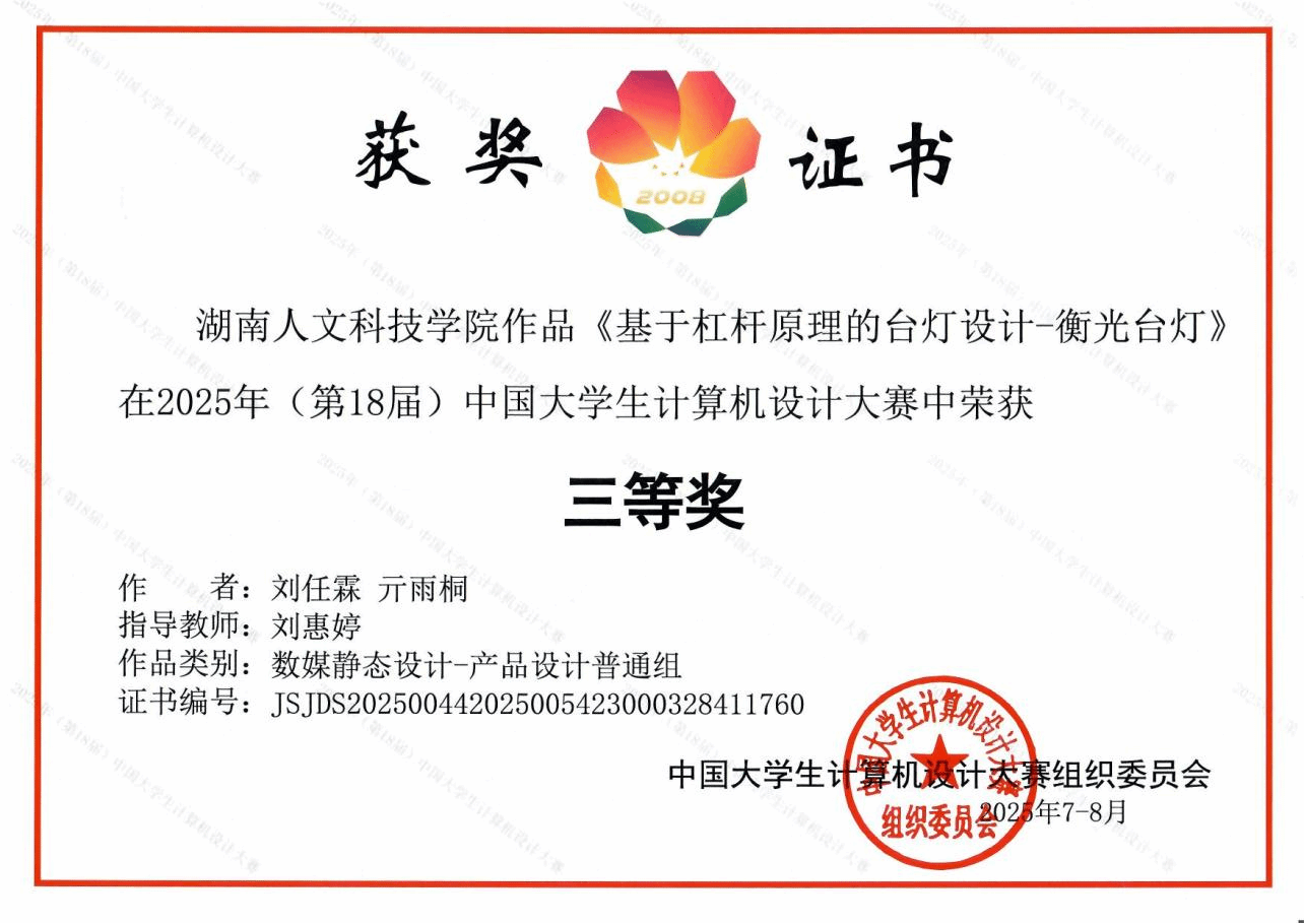 7月22日至26日,由中国大学生计算机设计大赛组织委员会主办的第18届中国大学生计算机设计大赛全国总决赛(微课与AI辅助教学与静态数媒设计赛道)在南京大学举行。太阳成官网法学院刘任霖、亓雨桐团队作品《基于杠杆原理的台灯设计——衡光台灯》(指导教师:刘惠婷)荣获静态数媒设计组全国三等奖。