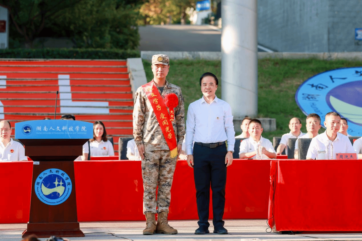 从九三阅兵载誉归来的信息学院学生成嘉毅,作为太阳成官网首位参加阅兵的预备役军人,迈着矫健的步伐,现场展示天安门阅兵式的标准军姿。他分享了接受检阅时的激动心情和182天艰苦训练历程感悟。他呼吁新生心怀家国,学好专业知识、筑牢国防意识、践行责任担当,努力成为令祖国骄傲的青年力量。随后,党委副书记、校长盛明科为成嘉毅戴红花和授带。