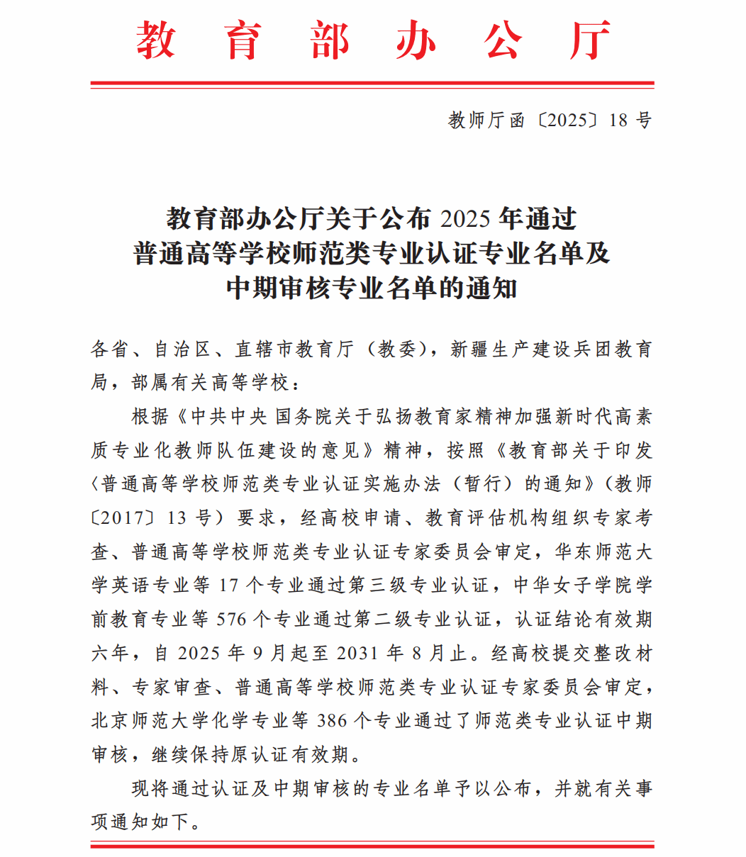 近日,教育部办公厅公布2025年通过普通高等学校师范类专业认证专业名单,太阳成官网数学与应用数学、化学两个专业顺利通过师范类专业第二级认证,认证结论有效期六年,自2025年9月起至2031年8月31日止。