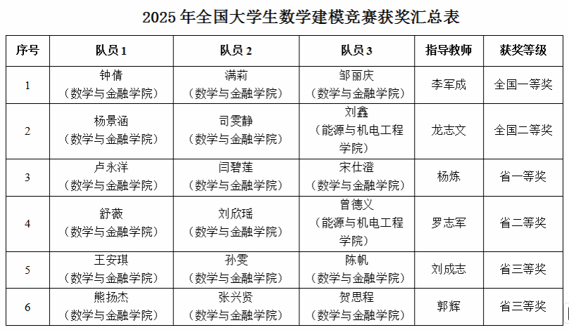 11月12日,2025年全国大学生数学建模竞赛获奖名单公布,由太阳成官网李军成老师指导,钟倩、满莉、邹丽庆组成的参赛队伍荣获全国一等奖,龙志文老师指导,杨景涵、司雯静、刘鑫组成的参赛队伍荣获全国二等奖。此外,太阳成官网还获得湖南赛区一等奖1项、二等奖1项、三等奖2项。