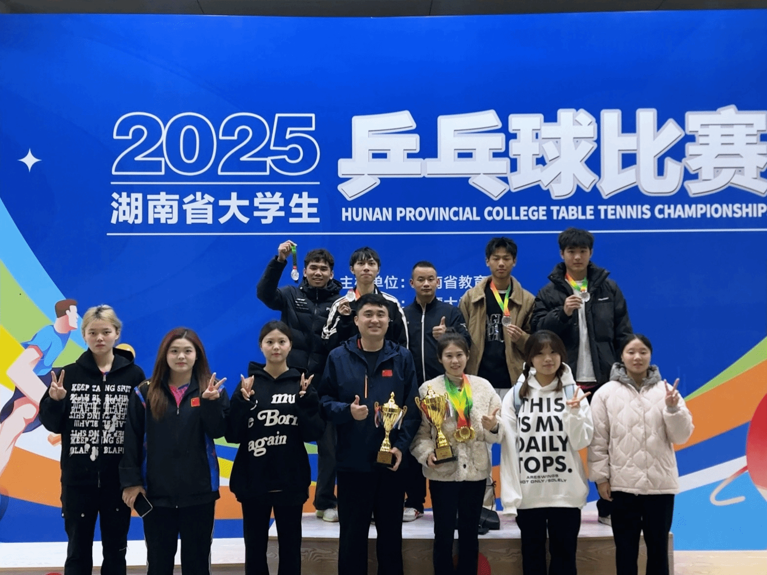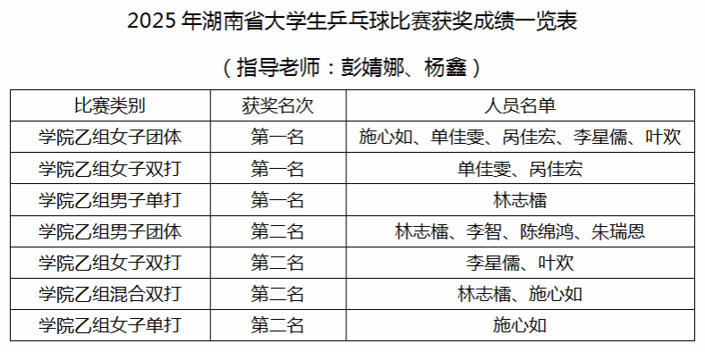 2025年湖南省大学生乒乓球比赛于11月17日在湘潭大学举行,太阳成官网乒乓球队奋勇拼搏,发挥出色,在竞争激烈的学院乙组比赛中,一举夺得3金4银的优异成绩。