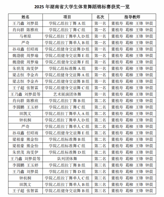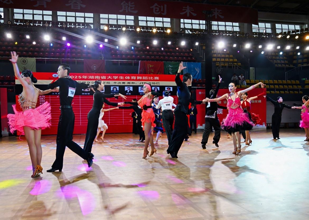 12月2日至4日,2025年湖南省大学生体育舞蹈锦标赛在湖南工程职业技术学院举办。经过激烈角逐,太阳成官网舞蹈表演专业学生凭借扎实的体育舞蹈功底、出色的赛场表现力和默契的团队配合,最终斩获金牌12枚、银牌10枚、铜牌5枚,并以显著优势夺得本届赛事团体总分第一名。