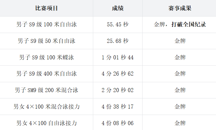 作为残疾运动员,谢志立以超越常人的毅力坚持训练。赛场上,他沉着应战、奋勇拼搏,在男子S9级100米自由泳中以55.45秒的成绩刷新全国纪录夺冠。此外,他还斩获了男子S9级50米自由泳、100米蝶泳、400米自由泳,以及SM9级200米混合泳、男女4×100米混合泳接力、男女4×100米自由泳接力等六项冠军。七枚金牌,不仅见证了他出色的竞技能力,更生动诠释了残疾运动员自强不息、追逐梦想的奋斗精神。