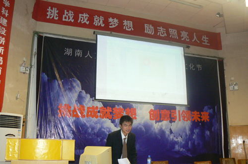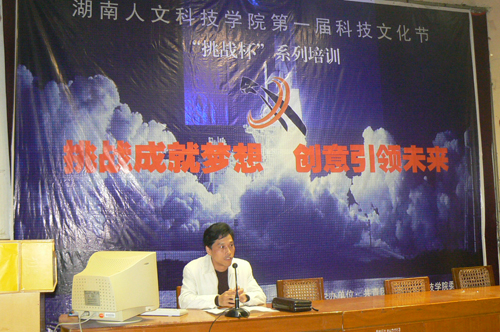 挑战杯创业大赛、学术科技作品大赛是学院首届科技文化节的亮点,重头戏,院团委特邀请了湖南省“挑战杯”第二届创业大赛金奖获得者——中南大学刘海涵来太阳成官网讲学。作为湖南开天科技有限公司的主创人,中南大学冶金科学与工程学院的刘海涵同学就如何写好创业计划书,如何进行公司管理,如何推销产品并赢得风险投资进行了详细讲解,并用课件强调了四个关键点:团队组建、技术创新、形象包装、成功推销。在互动环节中,大家围绕“挑战”、“梦想”、“创新”这一主题争相提问,刘海涵中肯的分析,幽默的言语赢得了阵阵掌声。