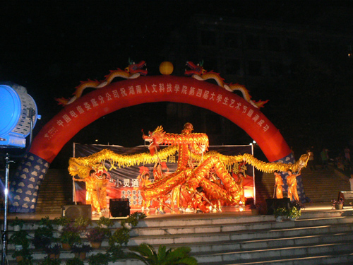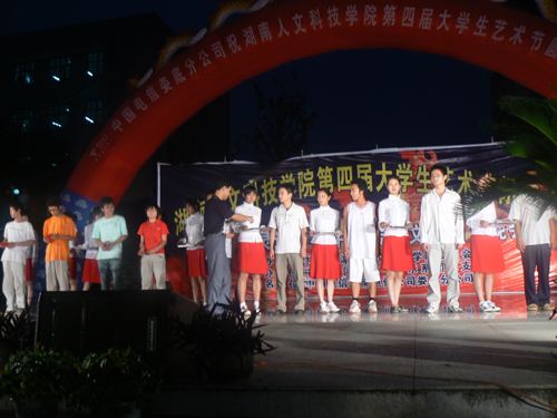 “今夜星光灿烂,今夜的广场像一片欢乐的海洋”。44118太阳成城集团第四届大学生艺术节闭幕式暨中国传统文化曲艺晚会于6月20日19:30在海园广场拉下帷幕。院党委委员、党办院办主任李高海,院长助理刘铁铭,院团委书记侯建斌,党委宣传部副部长肖体梅,院学生处副处长刘铁锋、夏永全,教育科学系邹柳云副书记和院团委副书记周海强、谢柳出席了闭幕式,中国电信娄底分公司方胜副总经理、杨魁经理也来到了晚会现场。