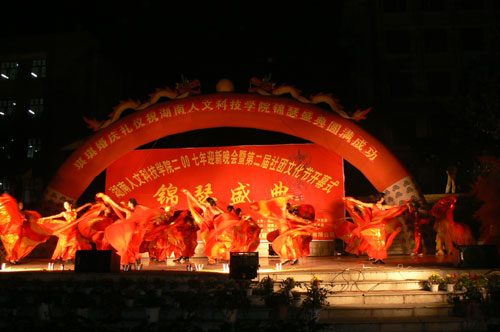 晚会在大型的歌舞《辉煌娄底》中拉开序幕。在节目正式开始前,院长助理刘铁铭同志发表了热情洋溢的讲话。他首先向来自全国各地的新生表示了热烈的欢迎,介绍了院里各社团发展的规模,强调了抓“三爱”促“三风”教育活动和大力发展社团文化的重要意义。