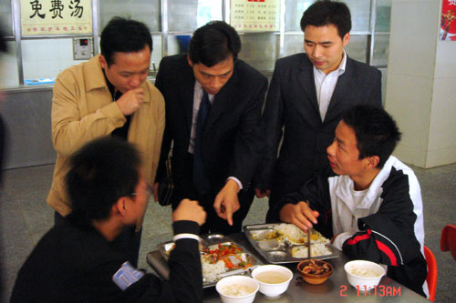 在刘铁铭院助、总公司负责人、饮食服务中心负责人、一食堂管理员等的陪同下,评估组的领导和专家对一食堂的基础建设、微机管理、民主管理、制度建设、服务质量、伙食质量、花色品种、清洁卫生、物资管理与成本核算等各方面情况进行了考察和了解,仔细询问了员工有关卫生、保管、操作等各方面的要求和流程,并和就餐的同学就饭菜质量、价格等方面的情况进行了亲切交谈。
