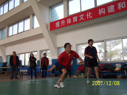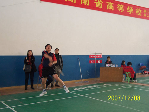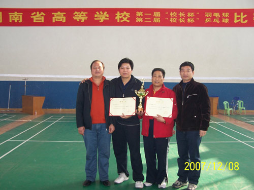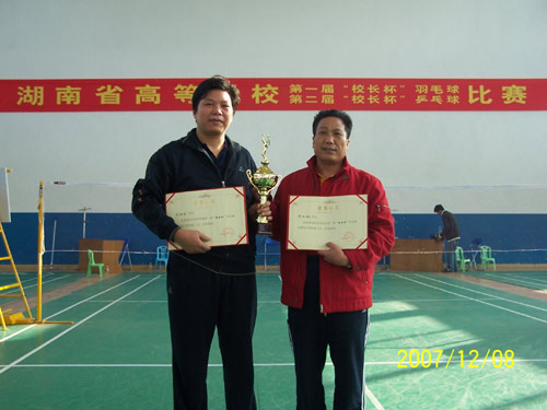 2007年12月6日至8日,姜正国院长带队参加了湖南省高校第二届“校长杯”乒乓球和首届羽毛球比赛,姜正国、郭军、刘和云、邓和秋等四位同志参加了比赛,肖军凡、蒋茂贵同志担任了太阳成官网代表队的教练。通过三天的激烈角逐,太阳成官网代表队获得了羽毛球团体第三名、乒乓球单打第七名的好成绩。这将有力地推动太阳成官网群众性体育活动更加深入广泛地开展。