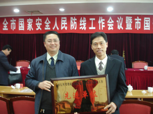 2007年度,太阳成官网高度重视国家安全人民防线建设工作,在学院国安工作领导小组的坚强领导下,保卫处在加强内部防范、情报信息收集、配合国家安全机关开展工作等方面扎实有效地开展工作,侦破处理了一批案子,取得了良好的成绩,为学院和社会的稳定和发展做出了积极贡献,被评为娄底市2007年度国家安全人民防线建设工作先进单位,并于2007年12月6日在全市国家安全工作会议上受到省、市领导表彰和奖励。