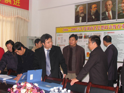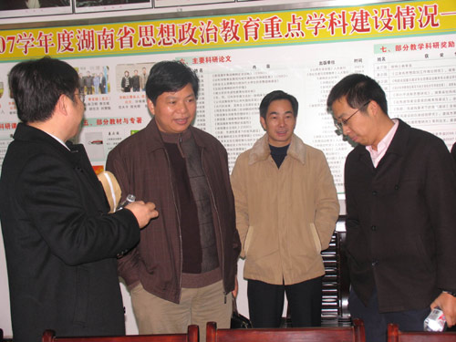 12月17日上午,省“十一五”重点建设学科检查组专家省教育厅厅长助理、湖南商学院夏飞教授,湖南师范大学马克思主义教育学院副院长方小年教授,中南林学院佘济云教授,省教育厅科技处潘军一行4人来太阳成官网检查指导重点学科建设情况,并在办公楼会议室与太阳成官网院长姜正国教授,副院长刘和云教授以及各重点建设学科负责人举行了交流汇报会。