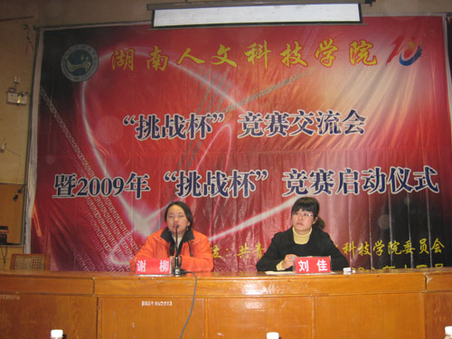 仪式首先由谢副书记对“挑战杯”作了简明的介绍,并对明年“挑战杯”的参赛工作做了具体的安排。随后,十名亲历过“挑战杯”并取得可喜成绩的同学——2008年湖南省“挑战杯”创业计划大赛金银铜获奖者柴娟娟、谌巍、曾令鹏、李康康等和参加学校“挑战杯”学术科技作品大赛取得优异成绩的朱平、石戈峰以自己参加挑战杯的经历,向学弟学妹们生动地介绍了挑战杯,分享了他们在参赛过程中的所思所感所得。在他们的发言中都强调了团队精神和创新意识的重要性以及成功的关键——坚持不懈!正如他们所说:“挑战杯带来的不仅仅是荣誉和奖杯,还有课本上学不到的知识和可贵的经历”。竞赛交流会起到了抛砖引玉的作用。