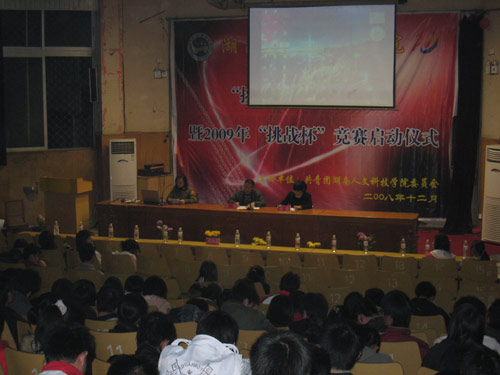 12月12日晚7:00,太阳成官网“挑战杯”竞赛交流会暨2009年“挑战杯”竞赛启动仪式在图书馆报告厅举行。出席仪式的有校团委副书记谢柳、团委干事刘佳以及各系团总支书记,各系对“挑战杯”竞赛感兴趣的学生参加了启动仪式。
