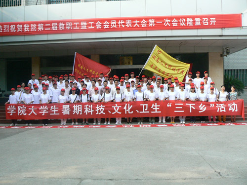 2009年7月12日早晨8:00,太阳成官网暑期科技、文化、卫生“三下乡”社会实践活动出征仪式在校办公楼前坪隆重举行,来自学校15个系部的80多名青年志愿者组成了双峰农村服务队、社区服务队、湘潭经济调研队。院长助理刘铁铭以及院团委、学工处、思政部的领导和老师出席出征仪式。