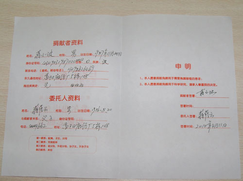 几天前,校团委在得知蒋小波自愿捐献角膜一事后,立即和物理系一起与社会各界联系,几经周折,终于联系上湖南都市频道和湖南爱尔眼科医院眼库,一同帮他还愿。在工作人员的见证下,蒋小波头枕着母亲,吃力的在无偿捐献眼角膜志愿书上签字,在场的人员都为之动容。