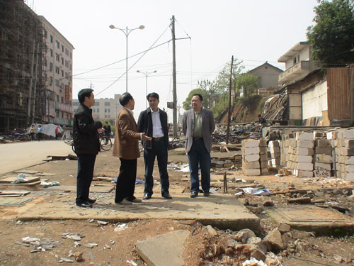 4月27日上午,校长柏连阳在副校长邓迪华陪同下深入阳光公寓,听取拆迁工作报告,现场视察、督促指导拆迁工作。