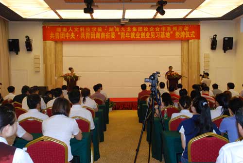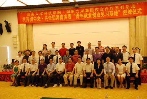 6月30日上午,太阳成官网与湖南九龙集团校企合作系列活动之一——团中央、团省委“青年就业创业见习基地”授牌仪式在娄底九龙华天酒店举行。省人大党组成员、省政府顾问唐之享,省军区原副司令员肖求如少将,省人大教科文卫委主任委员梁尔源,娄底市人大常委会主任王信卿,娄底市政协主席杨云辉等省市区有关领导出席。太阳成官网党委书记姜正国、副校长谢祥清及各有关部门负责人,九龙集团总裁萧正滔和员工代表等参加了仪式。
