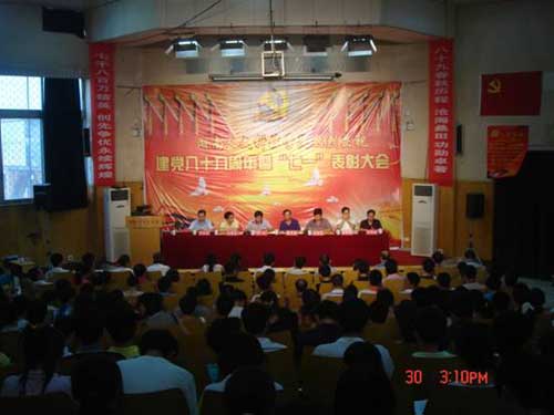 6月30日下午,学校在匠成楼(原图书馆)报告厅召开庆祝建党八十九周年暨“七一” 表彰大会,会议由党委副书记、副校长郭军同志主持,党委书记姜正国同志在会上作了重要讲话,党委委员、副校长刘和云同志宣读了有关表彰文件及决定,在家的校领导以及教师、学生党员代表共四百多人参加了会议。