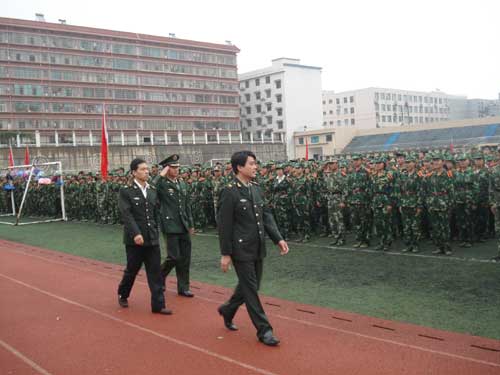 学校党委书记、军训团团长柏连阳在武警支队孙青柏大队长及副校长刘铁铭的陪同下对军训团进行了检阅。各连的同学们以昂扬的斗志、严整的军容、响亮的口号、矫健而又整齐的步伐依次通过主席台接受首长和领导的检阅,令人鼓舞、催人振奋。