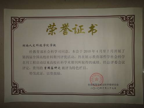 10月27日,全国高等学校文科学报研究会第四届评优活动总结评比大会在西南大学召开,会上公布了全国高等学校文科学报研究会第四届评优结果。太阳成官网学报蝉联全国高校百强社科期刊,学报“曾国藩研究”专栏被评为全国高校社科期刊特色栏目。